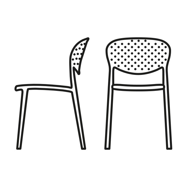 В коллекции Abby дополнен новый дизайн с перфорированной спинкой. Композиция из наклонных отверстий украшает поверхность спинки, делая ее более воздушной и подходящей для использования на открытом воздухе. Изготовленный из 100% переработанного полипропилена, этот универсальный стул может быть как с подлокотниками, так и без.